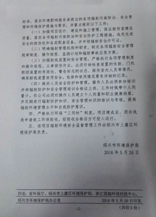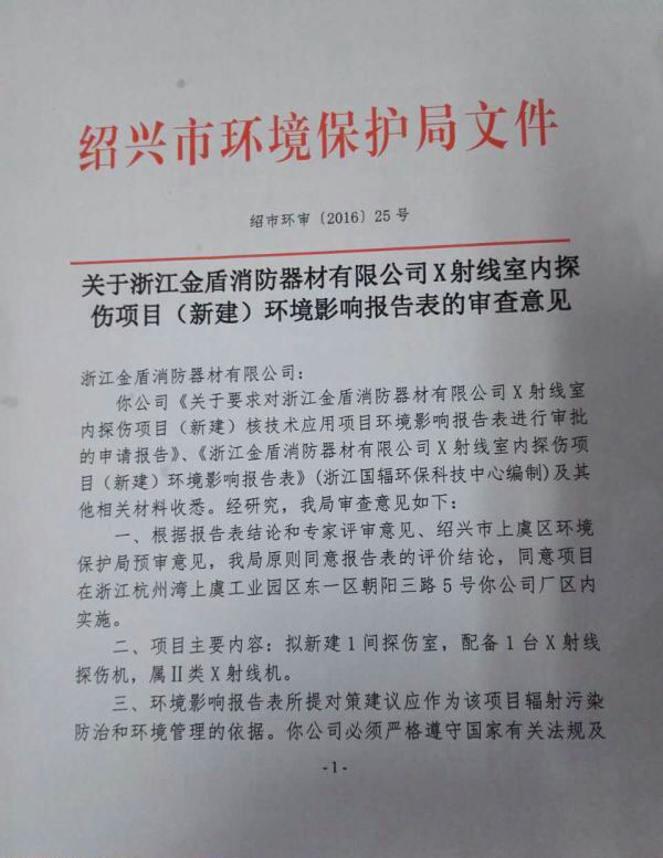 2016年5月26日,紹興市環(huán)境保護(hù)局同意我司(浙江金盾消防器材有限公司)X射線室內(nèi)探傷項(xiàng)目(新建)的環(huán)境影響報(bào)告。 該項(xiàng)目的報(bào)告審批通過后,X射線探傷室將步入正常工作。公司所生產(chǎn)的消防設(shè)備進(jìn)行無損檢驗(yàn)后,從而保證產(chǎn)品的質(zhì)量與生產(chǎn)的安全。